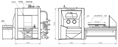 设有清洗及气吹装置,喷砂结束后 可用水及压缩空气对工件进行清洗, 清除工件上粘附的磨料及水珠。